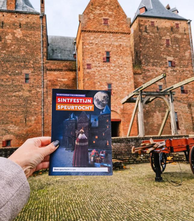 We denken ongeveer een uur. Maar je mag er zo lang over doen als je wil! Naast het Sintfestijn is er natuurlijk ook nog een prachtige vesting, een soldatendorp en een eeuwenoud kasteel om te ontdekken. De Taveerne is open voor wat te drinken en wat lekkers, en als je het leuk vindt kun je bij de receptie ook nog een ‘Hugo de Groot Speurtocht’ halen. Hier hoef je niet extra voor te betalen.