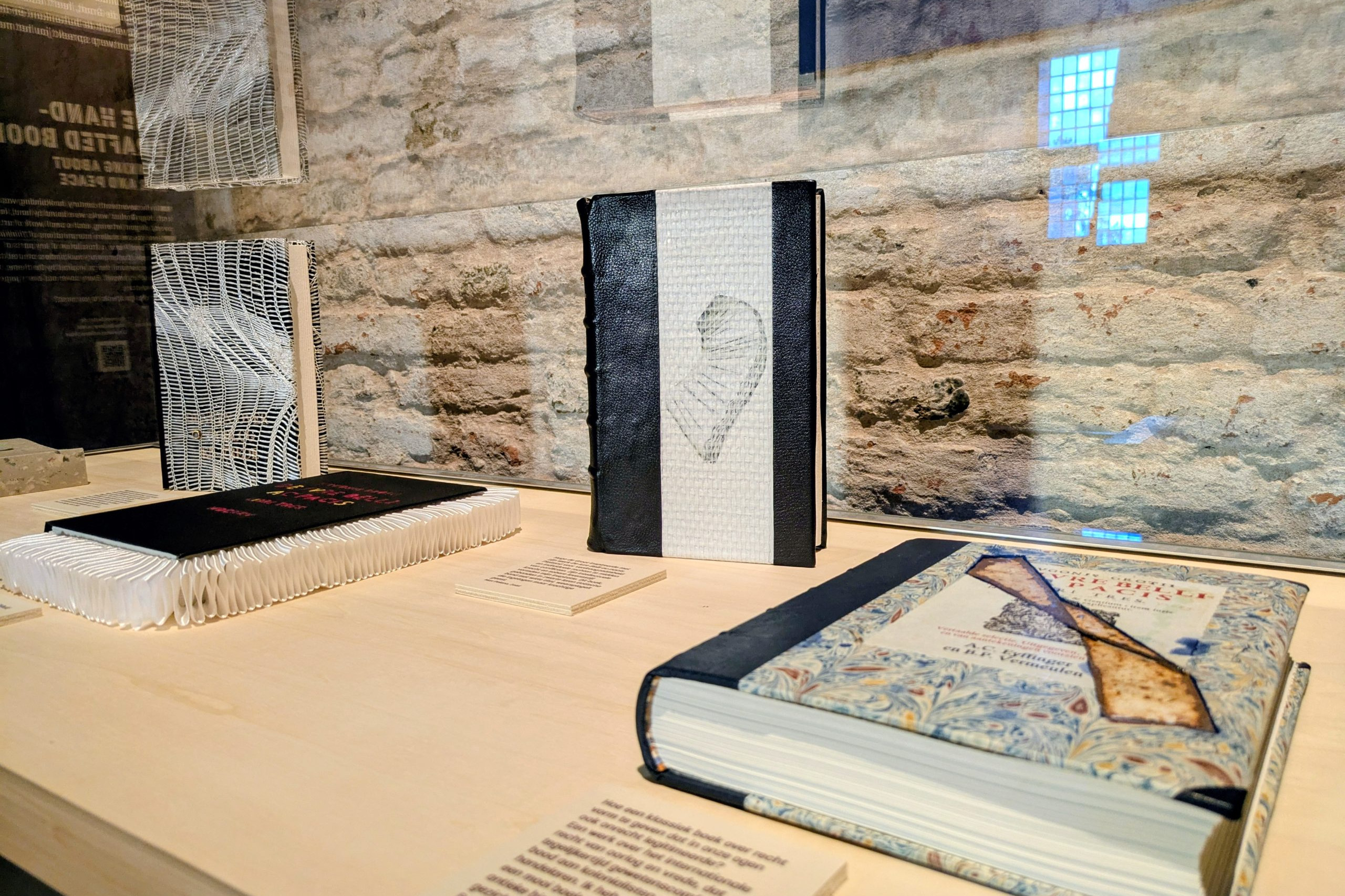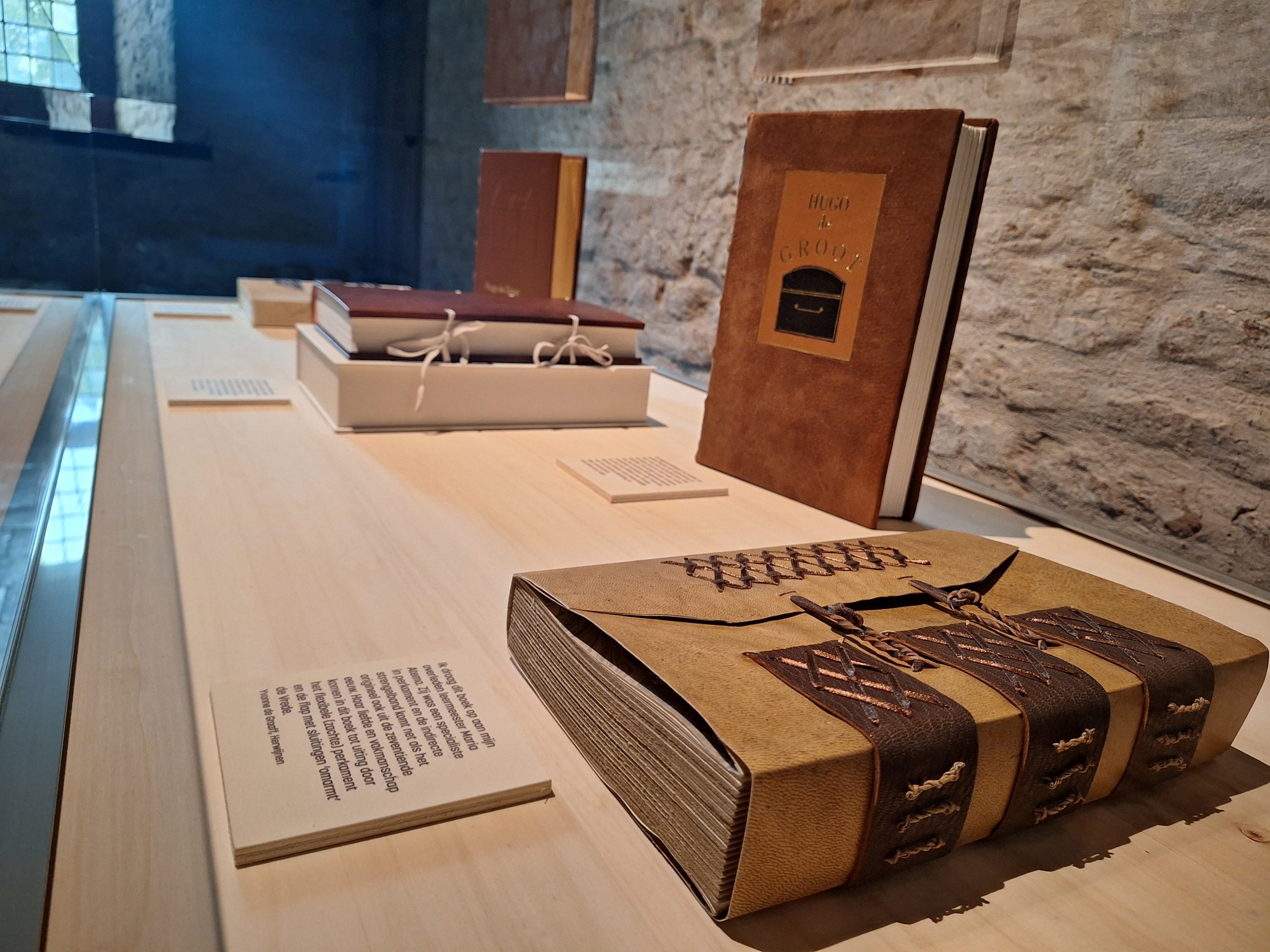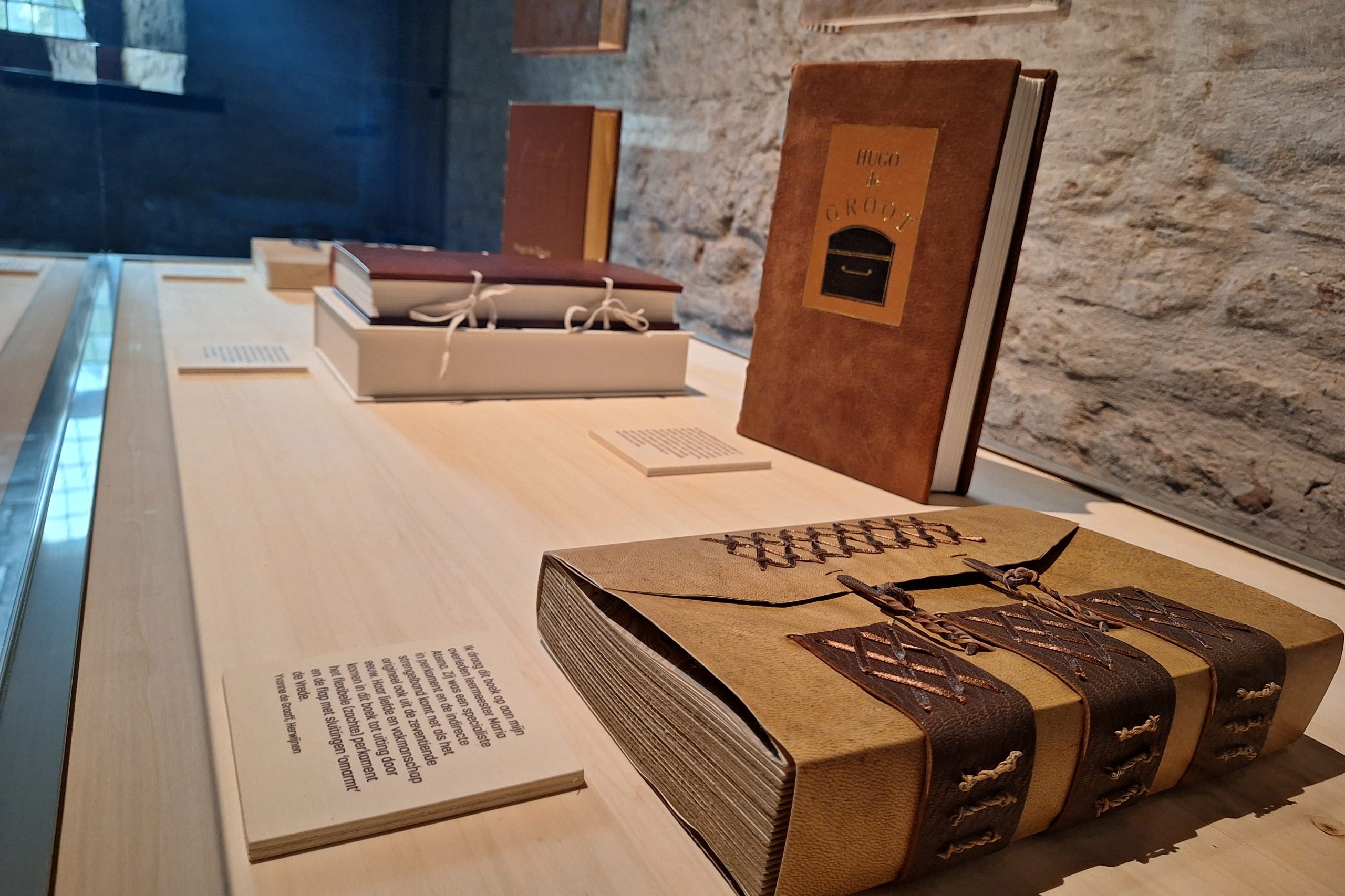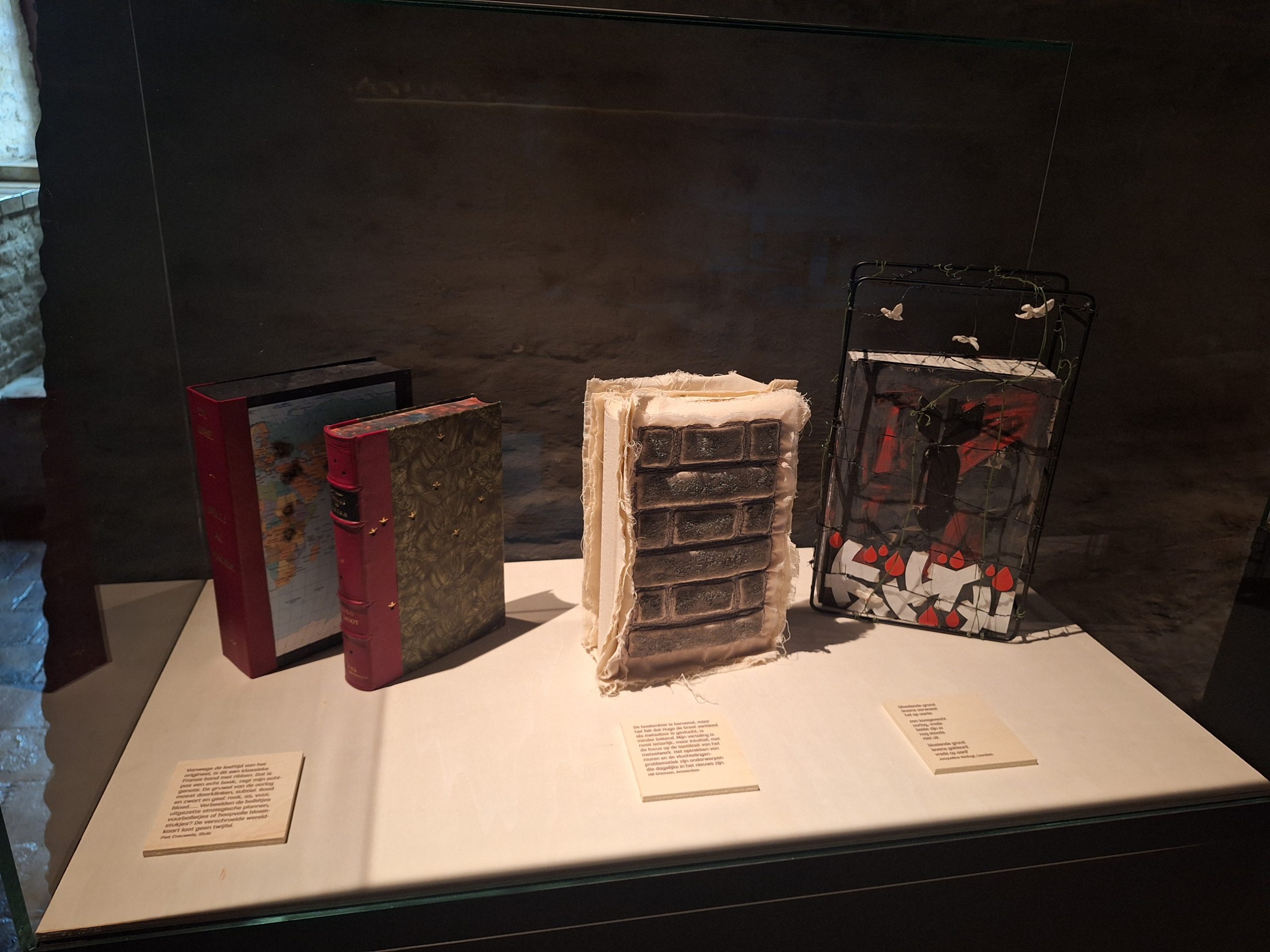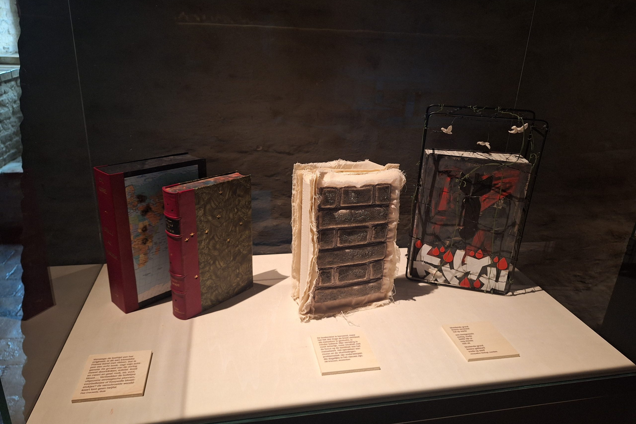 Voor deze deeltentoonstelling zijn hedendaagse handboekbinders uitgedaagd door Stichting Handboekbinden om, met de kennis van het heden, hun interpretatie te geven van Hugo de Groots belangrijke boek De Iure Belli Ac Pacis. Uitgangspunt is de uitgave uit 1991, Hugo de Groot. Denken over oorlog en vrede, met een keuze van fragmenten uit het origineel, door rechtshistoricus Arthur Eyffinger en jurist Ben Vermeulen.