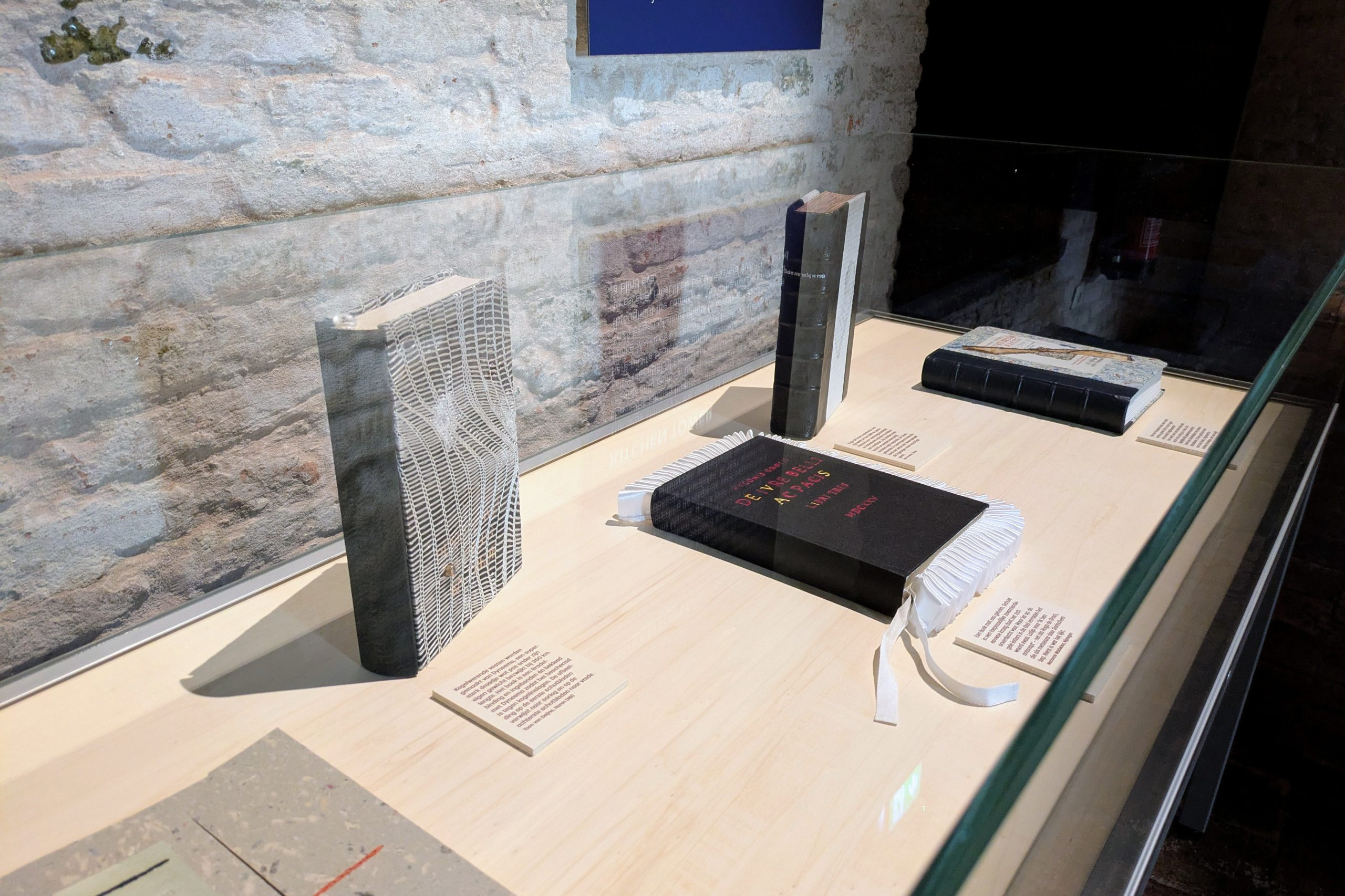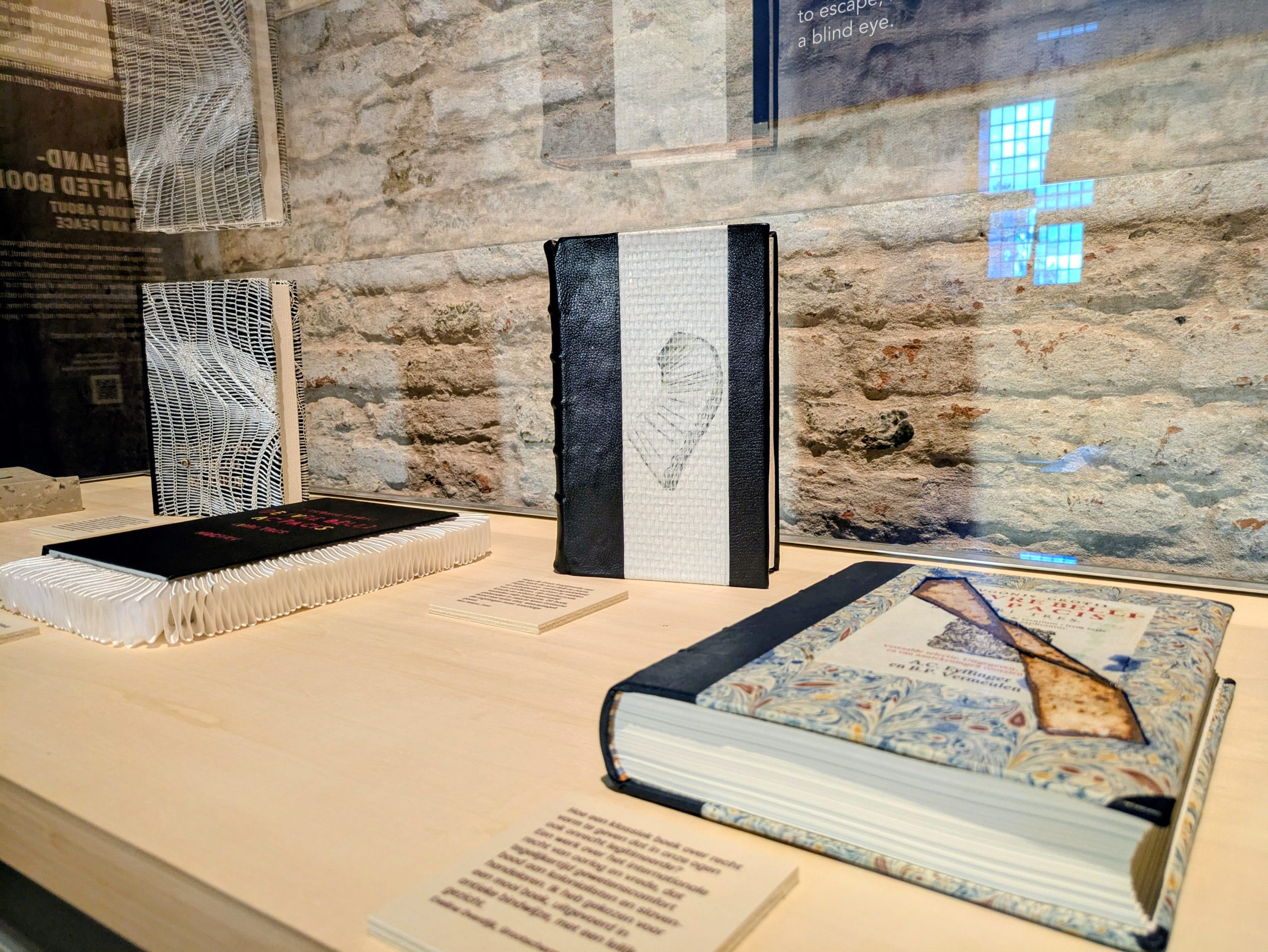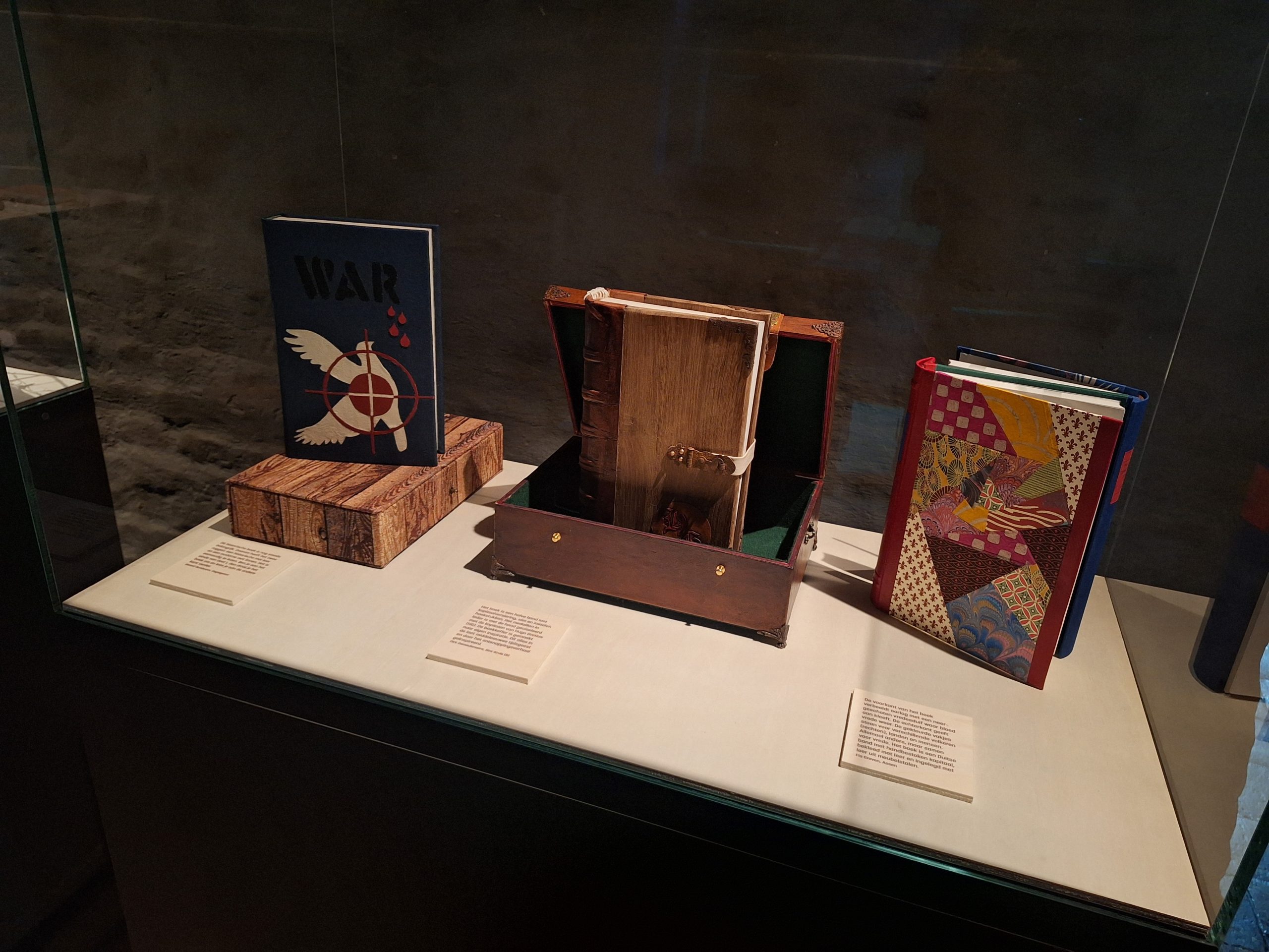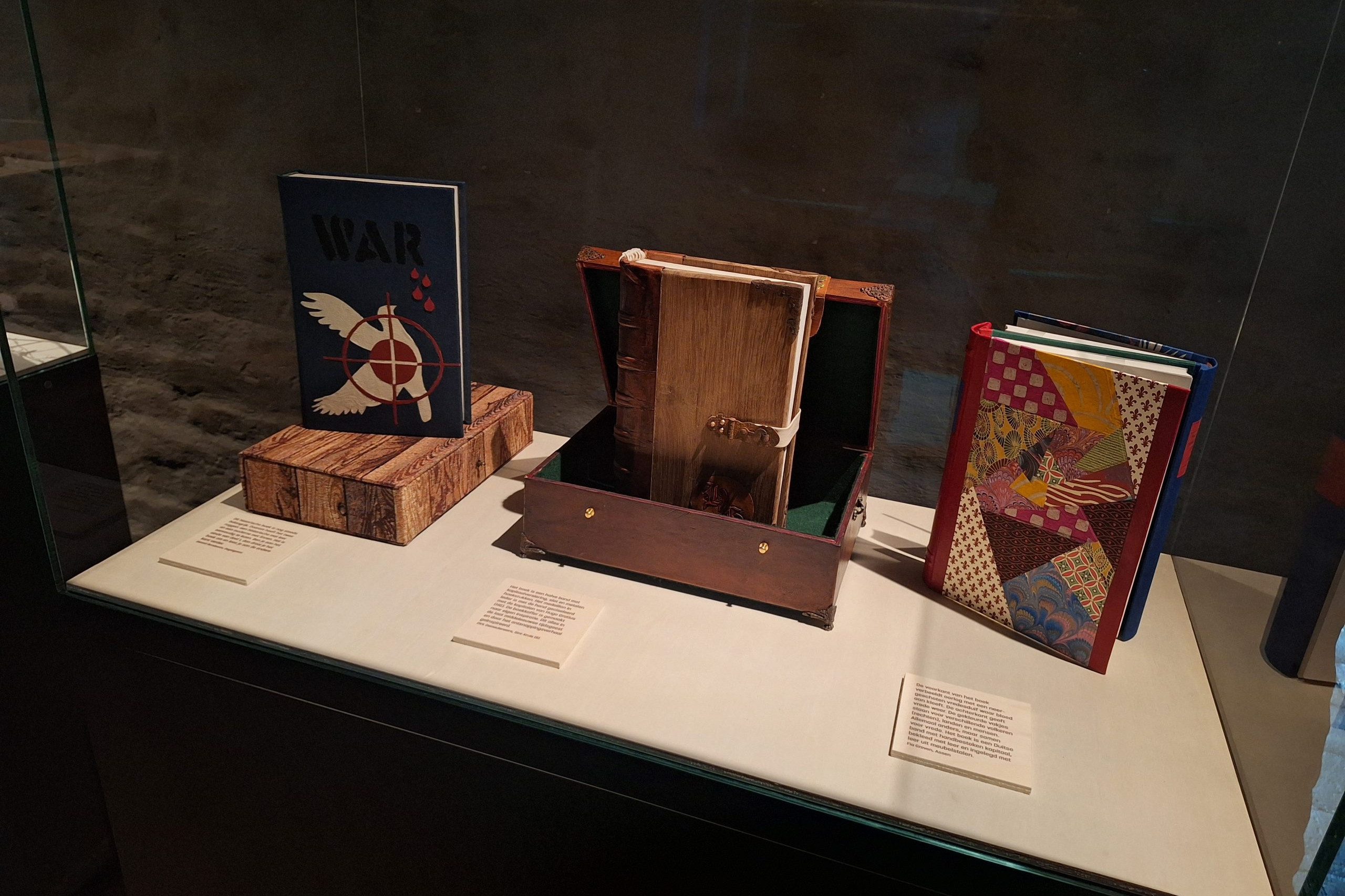 Voor deze deeltentoonstelling zijn hedendaagse handboekbinders uitgedaagd door Stichting Handboekbinden om, met de kennis van het heden, hun interpretatie te geven van Hugo de Groots belangrijke boek De Iure Belli Ac Pacis. Uitgangspunt is de uitgave uit 1991, Hugo de Groot. Denken over oorlog en vrede, met een keuze van fragmenten uit het origineel, door rechtshistoricus Arthur Eyffinger en jurist Ben Vermeulen.