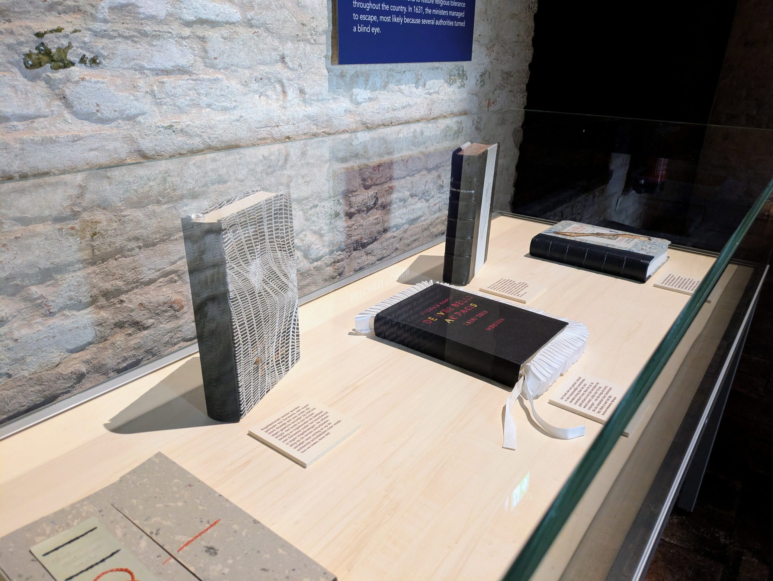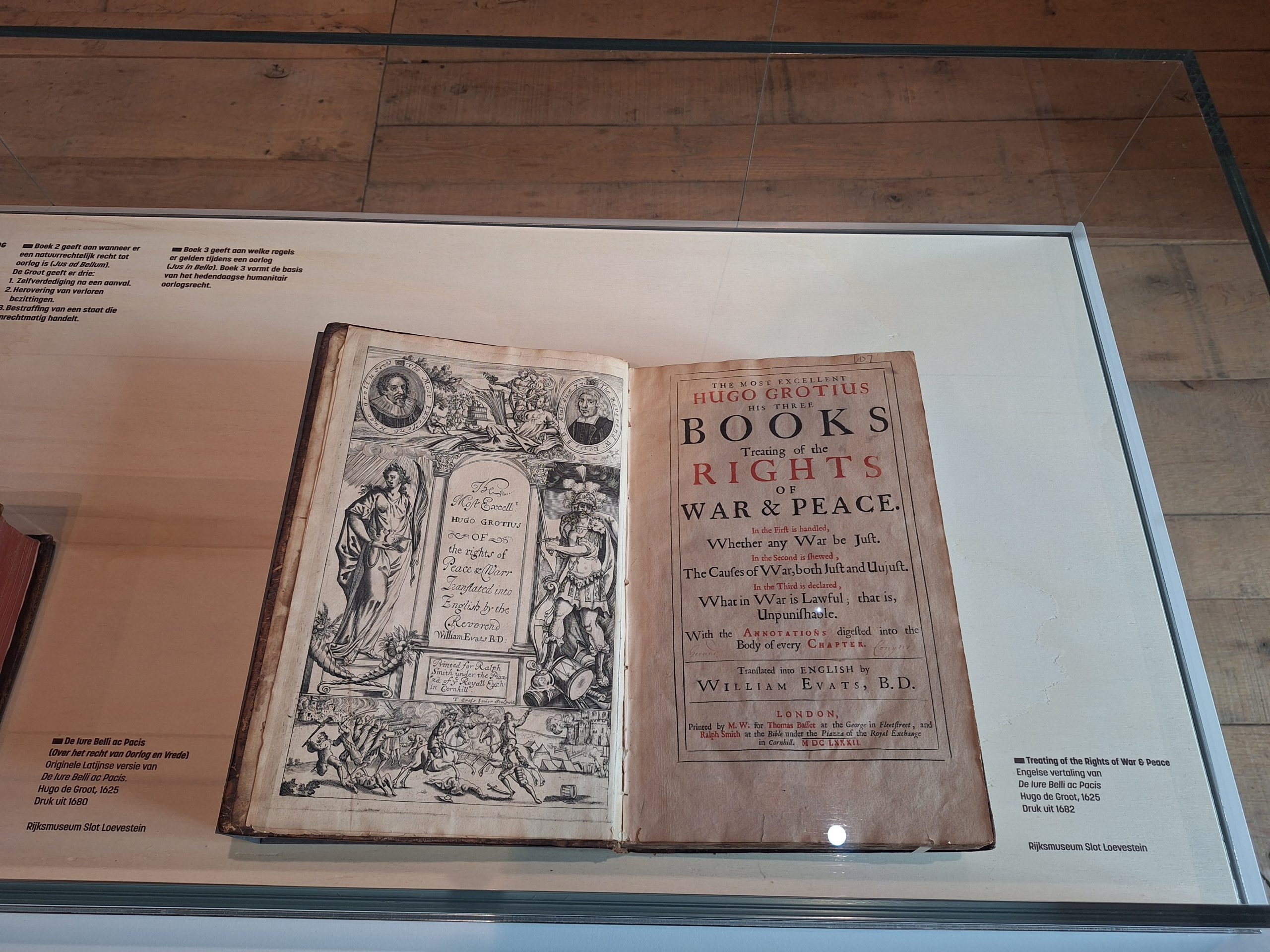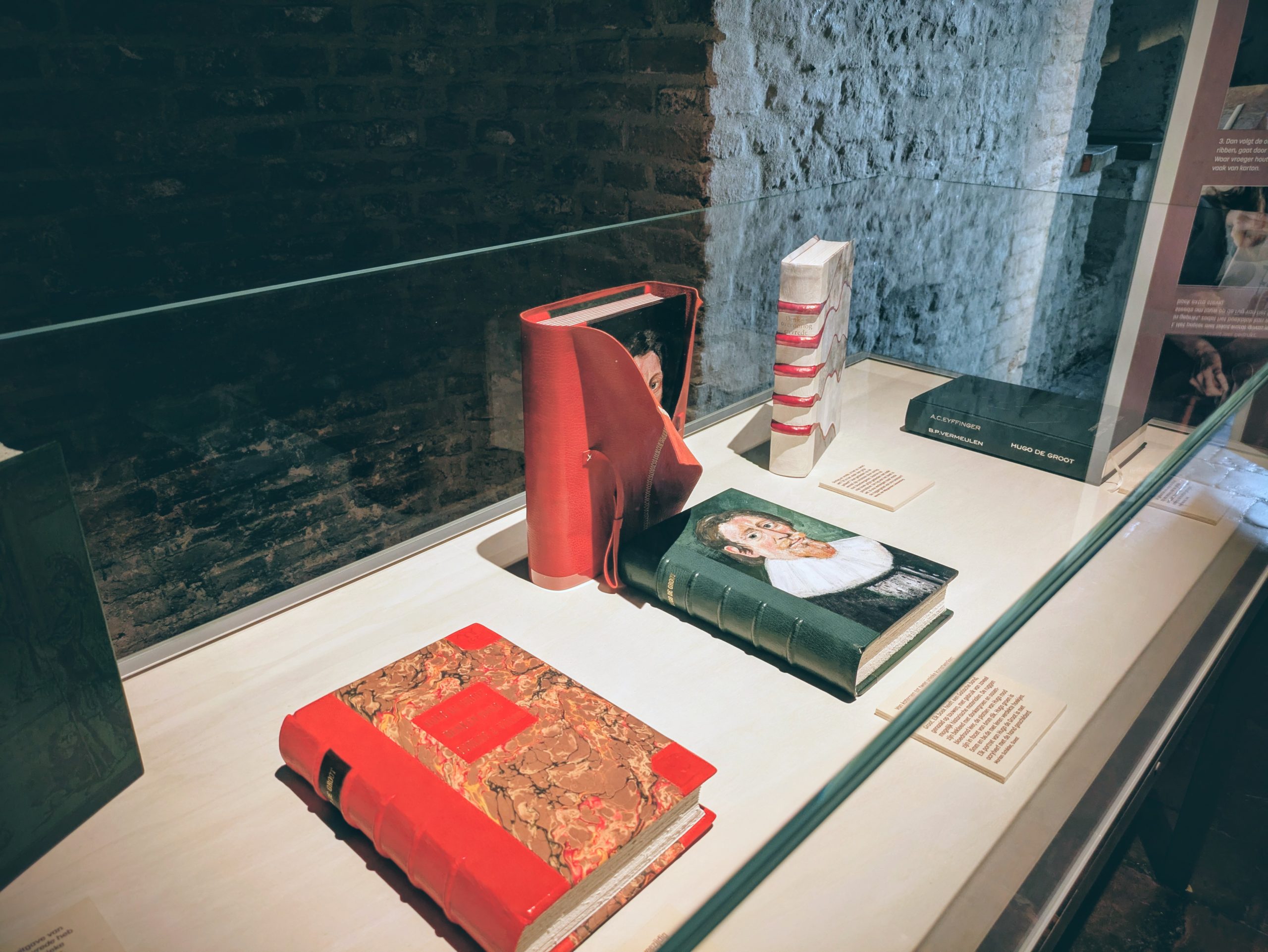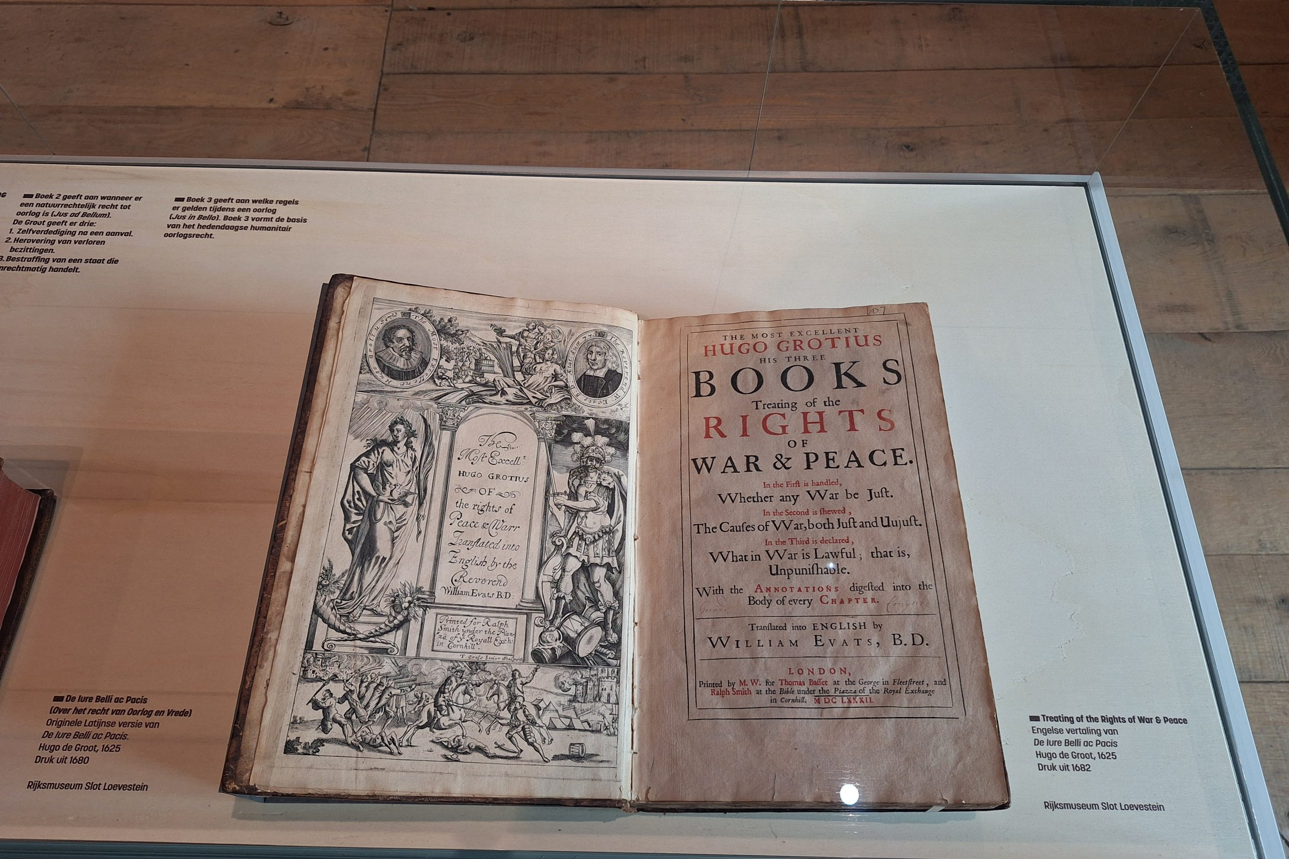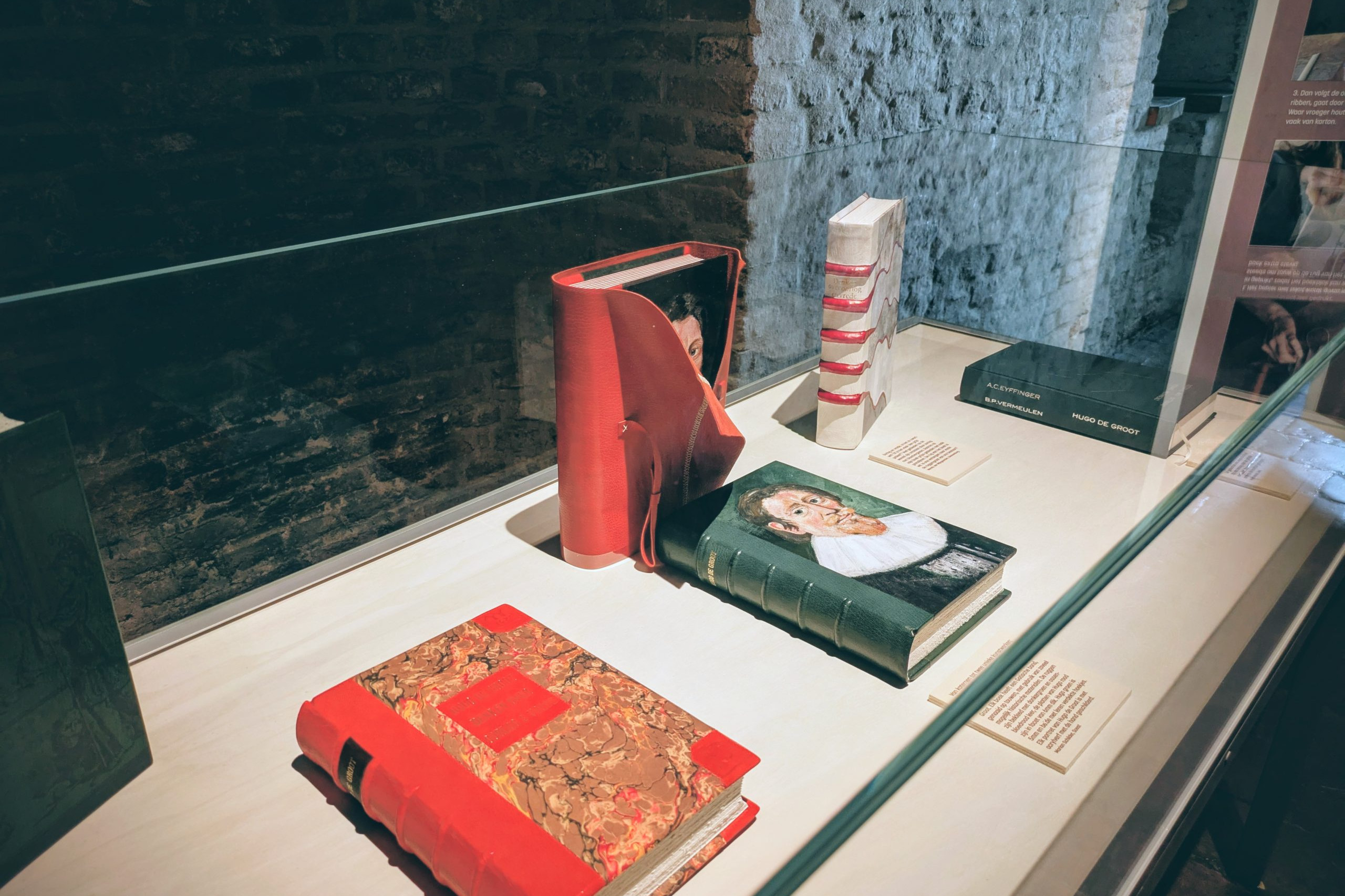 Voor deze deeltentoonstelling zijn hedendaagse handboekbinders uitgedaagd door Stichting Handboekbinden om, met de kennis van het heden, hun interpretatie te geven van Hugo de Groots belangrijke boek De Iure Belli Ac Pacis. Uitgangspunt is de uitgave uit 1991, Hugo de Groot. Denken over oorlog en vrede, met een keuze van fragmenten uit het origineel, door rechtshistoricus Arthur Eyffinger en jurist Ben Vermeulen.
